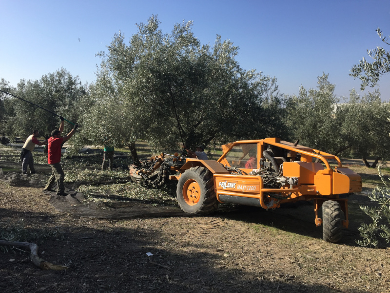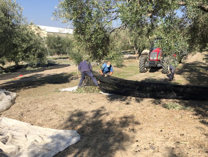 Once the olives and leaves have fallen onto the mat, they are collected and carried to the oil mill by a tractor.